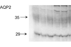 0.5 μg/ml of ABIN2486382 was sufficient for detection of aquaporin 2 in 10 μg of rat kidney tissue lysate by colorimetric immunoblot analysis using Goat anti-rabbit IgG:HRP as the secondary antibody.