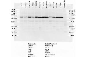 A 1:1000 dilution of ABIN2486717 was sufficient for detection of Calreticulin in 20 μg of HeLa cell lysate by ECL immunoblot analysis.