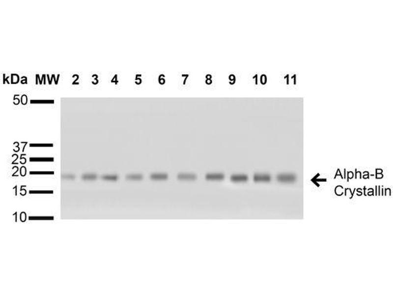 - Detects ~22 kDa. Does not cross-react with αA-crystallin.