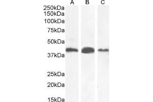 Western Blot: Approx 40-42 kDa band observed in Human Kidney, Liver and Coloretal cancer lysates, and in lysates of cell line CaCo-2, and approx 40.45 kDa band observed in lysates of cell line LNCaP (calculated MW of 42.4 kDa according to NP_055139.4) and