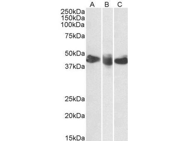 Western Blot: Approx 45 kDa band observed in Human Spleen, Tonsil and Thymus lysates (calculated MW of 29.2 kDa according to NP_001233.1). The observed molecular weight corresponds to the glycosylated form. Recommended concentration: 0.3-1 μg/mL.