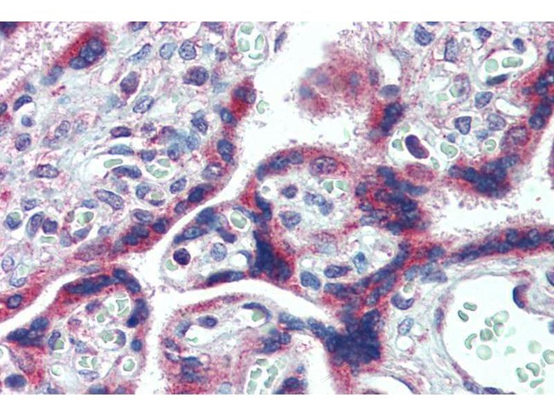 Immunohistochemistry: Paraffin embedded Human Placenta. Recommended concentration: 2.5 μg/mL.