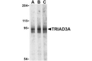 This antibody detects TRIAD3A. Located in the cytoplasm, TRIAD3A is ubiquitous, with the highest levels of expression in testis and peripheral blood leukocytes (Ref.6).
