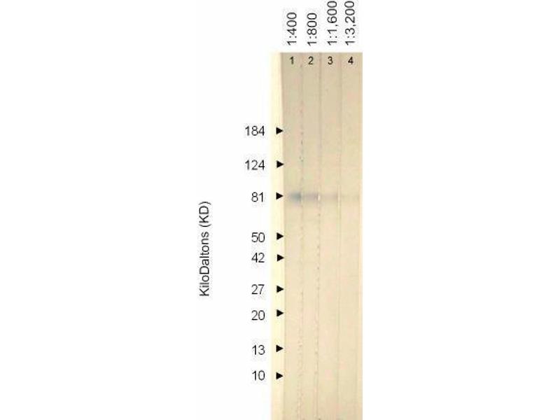 Western Blotting: > 1:3.200. Immunofluorescence: 1+ at 1:25.600. ELISA: 0.100 at 1:102.400