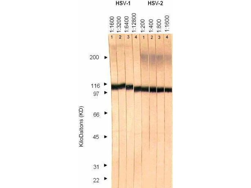Immunofluorescence: HSV-1: 1+ at 1:25.600. HSV-2: 1+ at 1:6.400. ELISA: 0.100 at 1:102.400. Western Blotting: HSV-1: >1:12.800. HSV-2: >1:1.600