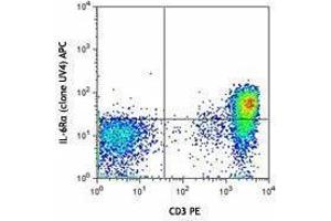 CD126 is an 80 kD IL-6 receptor α chain also known as IL-6R. It is a member of the immunoglobulin superfamily that is expressed on plasma cells, T cells, activated B cells, monocytes, granulocytes, hepatocytes, epithelial cells, and fibroblasts. Functional IL-6 receptors are formed by the non-covalent association of CD126 and the IL-6 receptor β chain (CD130 or gp130). CD126 binds IL-6 with low affinity but does not signal. The β chain (gp130, CD130) does not bind IL-6 by itself but associates with the α-chain/IL-6 complex to initiate signal transduction. IL-6 binding to the receptor complex results in the stimulation of B and T cells, and hematopoietic precursor proliferation and differentiation. A soluble form of CD126 has been found in human serum.