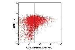 CD152, also known as Cytotoxic T-Lymphocyte Antigen 4 (CTLA-4), is a 33 kD member of the immunoglobulin superfamily. It is transiently expressed on activated T cells. CTLA4 is expressed on the surface of helper T cells and transmits an inhibitory signal to T cells. Regulatory T cells express high levels of CTLA-4. CTLA-4 (CD152) is similar to CD28 in amino acid sequence, structure, and genomic organization. Whereas CD28 delivers a costimulatory signal in T cell activation, CTLA-4 negatively regulates cell-mediated immune responses through interaction with CD80 (B7-1) and CD86 (B7-2) present on antigen presenting cells (APC). CTLA-4 is thought to play a role in the induction and maintenance of immunological tolerance as well as the development of protective immunity and thymocyte regulation. Mutations in the CTLA-4 gene have been associated with various autoimmune diseases, such as systemic lupus erythematosus, insulin-dependent diabetes mellitus, and other autoimmune diseases. A transcript of the CTLA-4 gene that may represent a native soluble form of CTLA-4 (sCTLA-4) showed that eleven of twenty patients with autoimmune thyroid disease (ATD) had a high concentration of sCTLA-4, whereas only 1 of 30 apparently healthy volunteers contained measurable levels. sCTLA-4 immunoreactivity was inhibited by its binding to B7.1, suggesting that sCTLA-4 is a functional receptor. sCTLA4 also plays a role in the initial immune response to infection of immune cells by HIV, along with the CD-1 pathway and others.