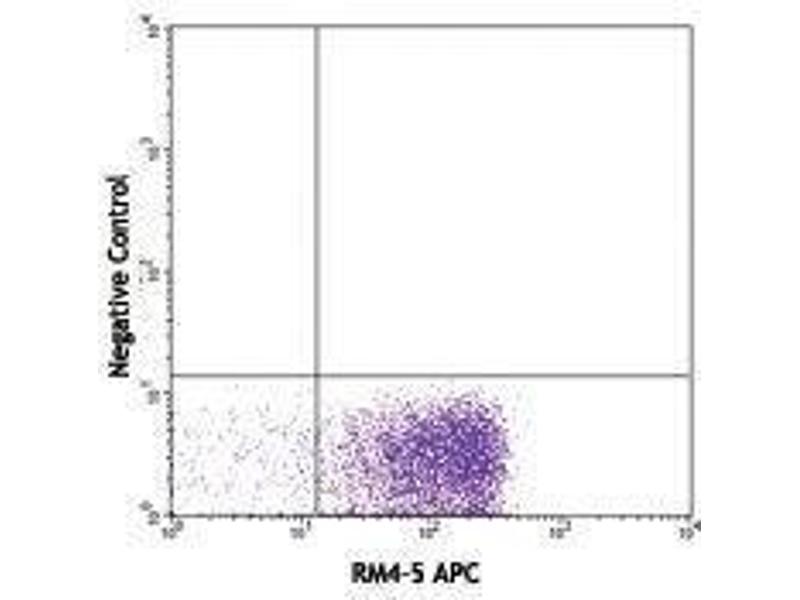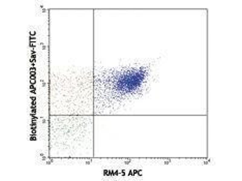 The APC003 antibody reacts with both allophycocyanin (APC) alone and APC conjugated with antibody or streptavidin, as well as APC tandem dyes such as APC/Cy5.5 and APC/Cy7. When APC003 antibody is used in a three-step staining procedure or separation of APC-antibody labelled cells, it neither quenches APC fluorescence nor reacts with tested mouse and human cells. The APC003 antibody can be used for separation of APC-antibody labeled cells or as a secondary step to amplify APC conjugated primary antibody signals (i.e. biotinylated APC003 as secondary step, followed by Streptavidin-APC).