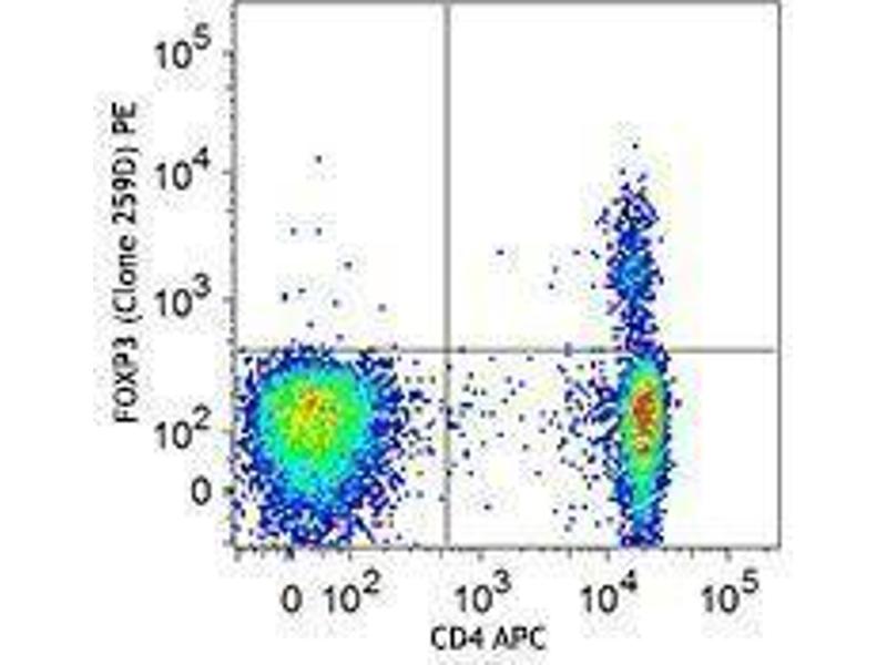 - FOXP3 is a 50-55 kD transcription factor, also known as Forkhead box protein P3, Scurfin, JM2, or IPEX. It is proposed to be a master regulatory gene and more specific marker of T regulatory cells than most cell surface markers (such as CD4 and CD25). Transduced expression of FOXP3 in CD4+/CD25- cells has been shown to induce GITR, CD103, and CTLA4 and impart a T regulatory cell phenotype. FOXP3 is mutated in X-linked autoimmunity-allergic dysregulation syndrome (XLAAD or IPEX) in humans and in "scurfy" mice. Overexpression of FOXP3 has been shown to lead to a hypoactive immune state suggesting that this transcriptional factor is a central regulator of T cell activity. In human, unlike in mouse, two isoforms of FOXP3 have been reported: one (FOXP3) corresponding to the canonical full-length sequence, the other (FOXP3 δ2) lacking exon 2. The 259D antibody recognizes human FOXP3 epitope in the region of amino acids 105-235.