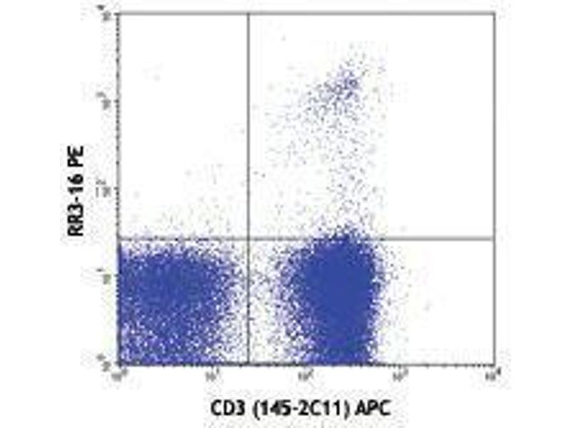 TCR is a heterodimer composed of alpha and beta chains or gamma and delta chains. TCR Vα elements expression is largely independent of MHC haplotype. It is likely that the Vαs interact preferentially with conserved region of class I or class II molecules. RR3-16 antibody reacts with the Vα 3.2 T-cell receptor (TCR) of mice having the b (e.g., C57BL/6) and c (e.g.,SJL, NOD) haplotypes, but not with the strains having the a ( Balb/c) or d (DBA/2) haplotype. Vα3.2 TCR is preferentially expressed by CD8+ T cells.