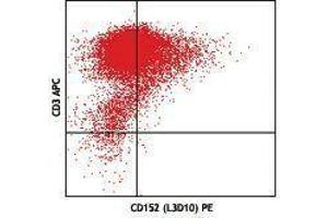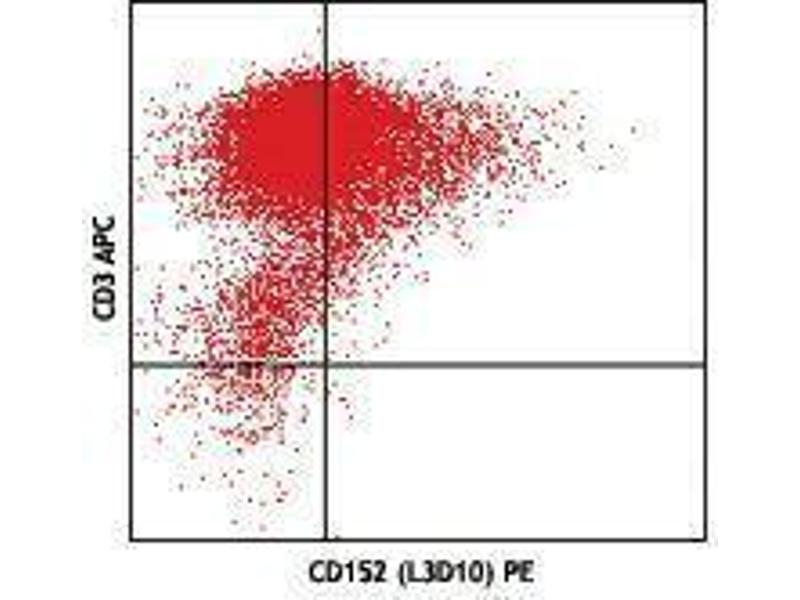 CD152, also known as Cytotoxic T-Lymphocyte Antigen 4 (CTLA-4), is a 33 kD member of the immunoglobulin superfamily. It is transiently expressed on activated T cells. CTLA4 is expressed on the surface of helper T cells and transmits an inhibitory signal to T cells. Regulatory T cells express high levels of CTLA-4. CTLA-4 (CD152) is similar to CD28 in amino acid sequence, structure, and genomic organization. Whereas CD28 delivers a costimulatory signal in T cell activation, CTLA-4 negatively regulates cell-mediated immune responses through interaction with CD80 (B7-1) and CD86 (B7-2) present on antigen presenting cells (APC). CTLA-4 is thought to play a role in the induction and maintenance of immunological tolerance as well as the development of protective immunity and thymocyte regulation. Mutations in the CTLA-4 gene have been associated with various autoimmune diseases, such as systemic lupus erythematosus, insulin-dependent diabetes mellitus, and other autoimmune diseases. A transcript of the CTLA-4 gene that may represent a native soluble form of CTLA-4 (sCTLA-4) showed that eleven of twenty patients with autoimmune thyroid disease (ATD) had a high concentration of sCTLA-4, whereas only 1 of 30 apparently healthy volunteers contained measurable levels. sCTLA-4 immunoreactivity was inhibited by its binding to B7.1, suggesting that sCTLA-4 is a functional receptor. sCTLA4 also plays a role in the initial immune response to infection of immune cells by HIV, along with the CD-1 pathway and others.