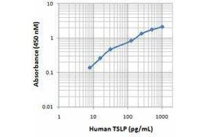 TSLP was initially identified in conditioned medium from a mouse thymic stromal cell line. Human and mouse TSLP are only 43 % identical at the amino acid level, and TSLP, like IL-7, exhibits species-specific functions and may function differently in humans and mice. TSLP binds to a heterodimeric receptor constituted by IL-7Ra and TSLPR. TSLPR has low affinity for TSLP, but in combination with IL-7Ra generates a high affinity binding site. TSLP has been associated with the development of allergic disorders in humans, such as asthma, atopic dermatitis, and food allergies. The susceptibility to allergic diseases has been associated to basophil induction by TSLP, and Th2 cytokine production induced by TSLP in mast cells. In addition, TSLP has been associated to the development of Tregs, and blocking TSLPR leads to delayed functional maturation of thymic Tregs. TSLPR has been detected in Tregs from allergic asthmatic patients. TSLP directly activates STAT5 in Tregs and suppresses its suppressive activities, additionally, it inhibits IL-10 production. Human TSLP induces the release of T cell-attracting chemokines (CCL17 and CCL22) from monocytes and enhances the T cell stimulatory capacity of the CD11c+ subset of dendritic cells. TSLP induces proliferation of naive T cells. In addition, it can drive Th2 differentiation via the induction of IL-4 production, and drives Th2 cytokine-mediated inflammation by acting on bone marrow-resident progenitors, which promotes basophil hematopoiesis. TSLP is upregulated in epithelial cells by IL-1α, TNFα, and Th2 cytokines.