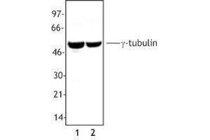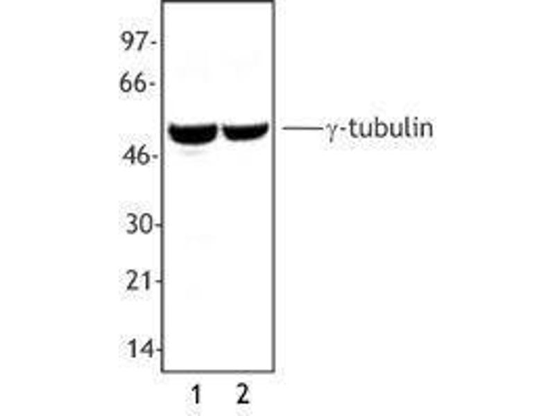 γ-tubulin is a 51 kD member of the tubulin superfamily and is conserved between yeast and mammals. This cytoskeletal protein is highly expressed in centrosomes and is thought to be involved in cytoskeletal organization and mitosis. γ-tubulin is expressed at highest levels during prophase to metaphase and can be modified by phosphorylation. This protein has been shown to interact with α-tubulin, paxillin, and RAC GTPase activated protein 1. The Poly6209 antibody has been shown to be useful for Western blotting of human and mouse γ-tubulin.