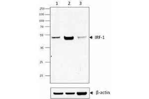 - IRF1 is the first identified member of the interferon regulatory transcription factor family. Its expression is induced in response to pathogen infection or the stimulation of several cytokines, including type I and II IFN, IL-1, IL-6, and TNF-α. Upon stimulation, IRF1 is transcriptionally activated by STAT1 and NFκB transcription factors via the GAS (interferon-gamma-activated sequence) element in the IRF1 promoter. IRF1 plays important roles in mediating immune response during infection and development of T cells and NK cells. In addition to the immunomodulatory functions, IRF1 has also shown to be involved in the regulation of cell cycle progression, tumor suppression, and apoptosis. IRF1-mediated transcription can be repressed by IRF2 through competing for the same binding region on the promoters.
