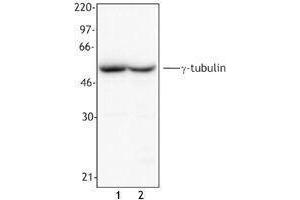 γ-tubulin is a 51 kD member of the tubulin superfamily and is conserved between yeast and mammals. This cytoskeletal protein is highly expressed in centrosomes and is thought to be involved in cytoskeletal organization and mitosis. γ-tubulin is expressed at highest levels during prophase to metaphase and can be modified by phosphorylation. This protein has been shown to interact with α-tubulin, paxillin, and RAC GTPase activated protein 1.