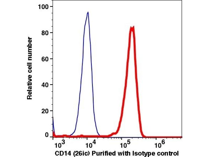- The clone 26ic, a mouse monoclonal antibody, reacts with a human 53-55 kDa glycosylphosphatidylinositol (GPI)- anchored single chain cell surface antigen known as CD14. The CD14 expression is commonly observed on monocytes, interfollicular macrophages, reticular dendritic cells and some Langerhans cells. 26ic binds with a complex of LPS and lipopolysaccharide binding protein, and blockade of CD14 with monoclonal antibodies prevented the synthesis of TNF-alpha by LPS activated leukocytes.