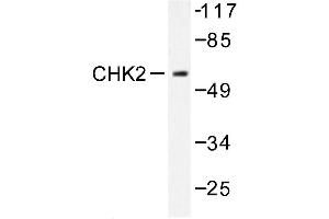 Cell cycle events are regulated by the sequential activation and deactivation of cyclin dependent kinases (Cdks) and by proteolysis of cyclins. Chk1 and Chk2 are involved in these processes as regulators of Cdks. Chk1 and Chk2 both function as essential components in the G2 DNA damage checkpoint by phosphorylating Cdc25C in response to DNA damage. Phosphorylation inhibits Cdc25C activity, thereby blocking mitosis. Cdc25A, Cdc25B and Cdc25C protein tyrosine phosphatases function as mitotic activators by dephosphorylating Cdc2 p34 on regulatory tyrosine residues. It has also been shown that Chk1 can phosphorylate Wee 1 in vitro, providing evidence that the hyperphosphorylated form of Wee 1, seen in cells delayed by Chk1 overexpression, is due to phosphorylation by Chk1.Synonyms: CHEK-2, CHEK2, CHK-2, CHK2 checkpoint homolog, Cds1, RAD53, Serine/threonine-protein kinase Chk2