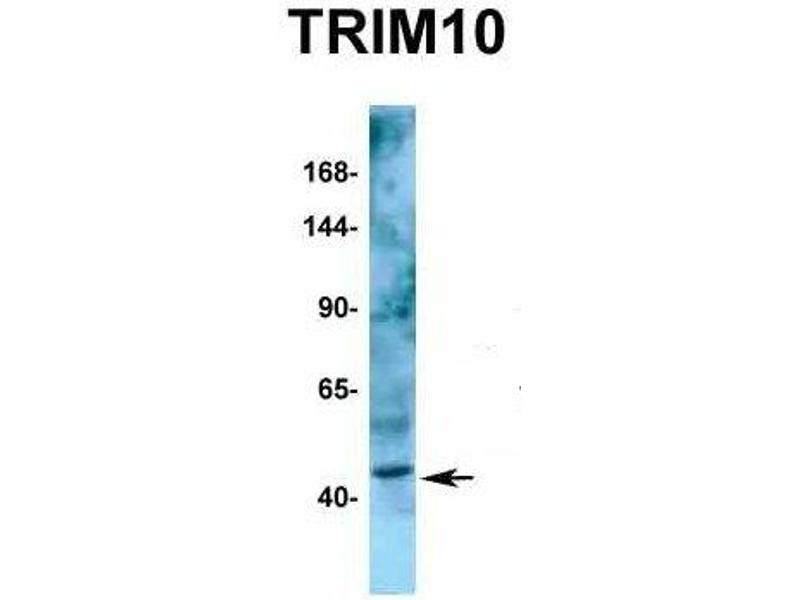 - This is a rabbit polyclonal antibody against TRIM10. It was validated on Western Blot using a cell lysate as a positive control.