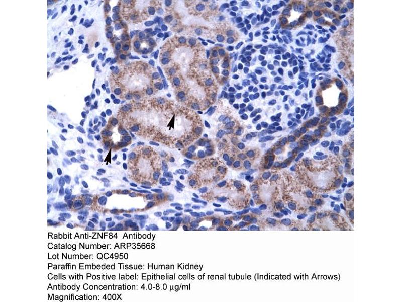 - This is a rabbit polyclonal antibody against ZNF84. It was validated on Western Blot and immunohistochemistry.