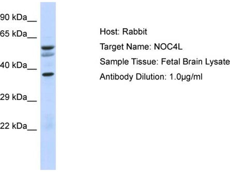 This is a rabbit polyclonal antibody against NOC4L. It was validated on Western Blot.