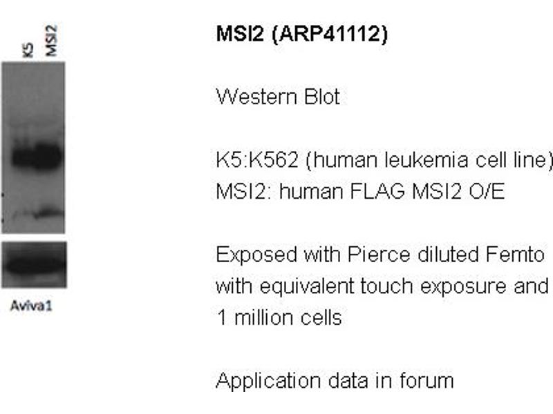 This is a rabbit polyclonal antibody against MSI2. It was validated on Western Blot and immunohistochemistry.