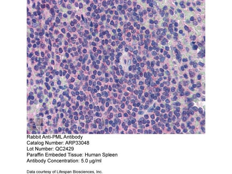 - The immunogen is a synthetic peptide directed towards the C terminal region of human PML