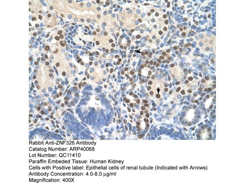 - This is a rabbit polyclonal antibody against ZNF326. It was validated on Western Blot and immunohistochemistry.