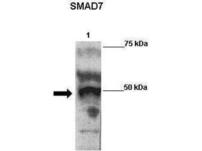 This is a rabbit polyclonal antibody against SMAD7. It was validated on Western Blot using a cell lysate as a positive control.