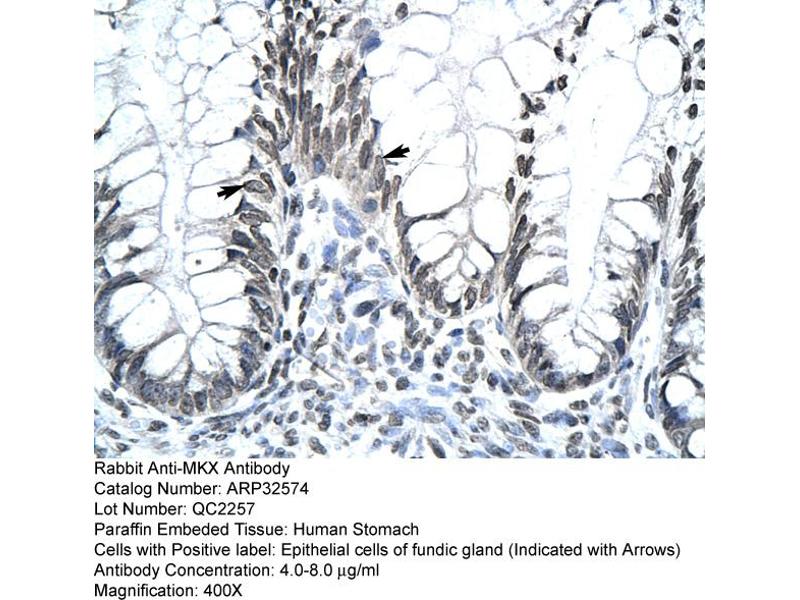 - The immunogen is a synthetic peptide directed towards the middle region of human MKX