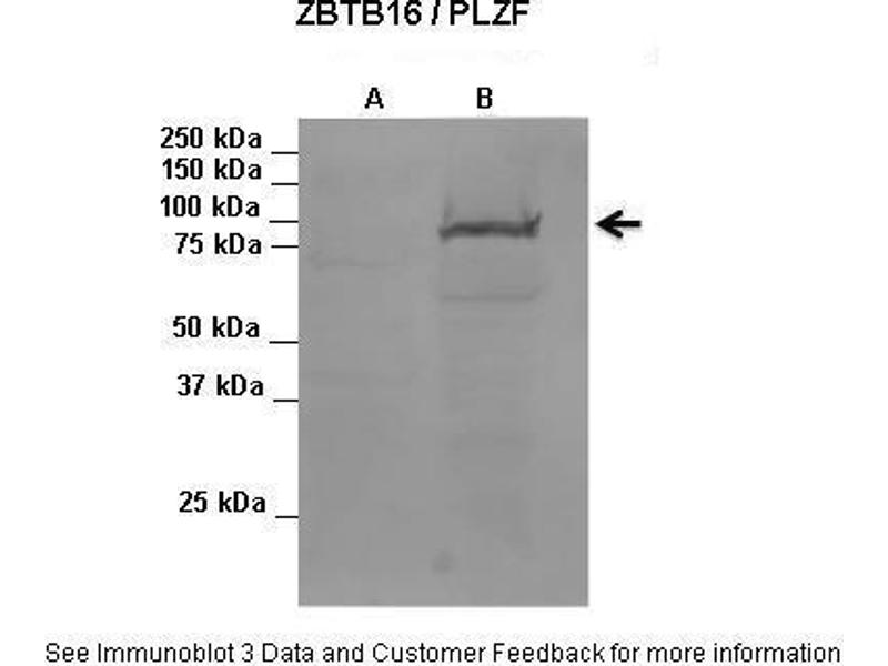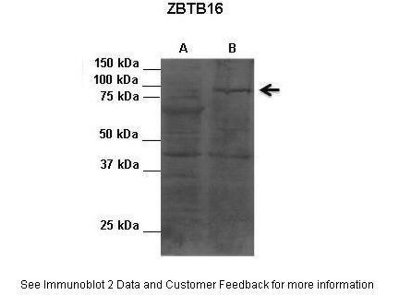 - This is a rabbit polyclonal antibody against ZBTB16. It was validated on Western Blot using a cell lysate as a positive control.