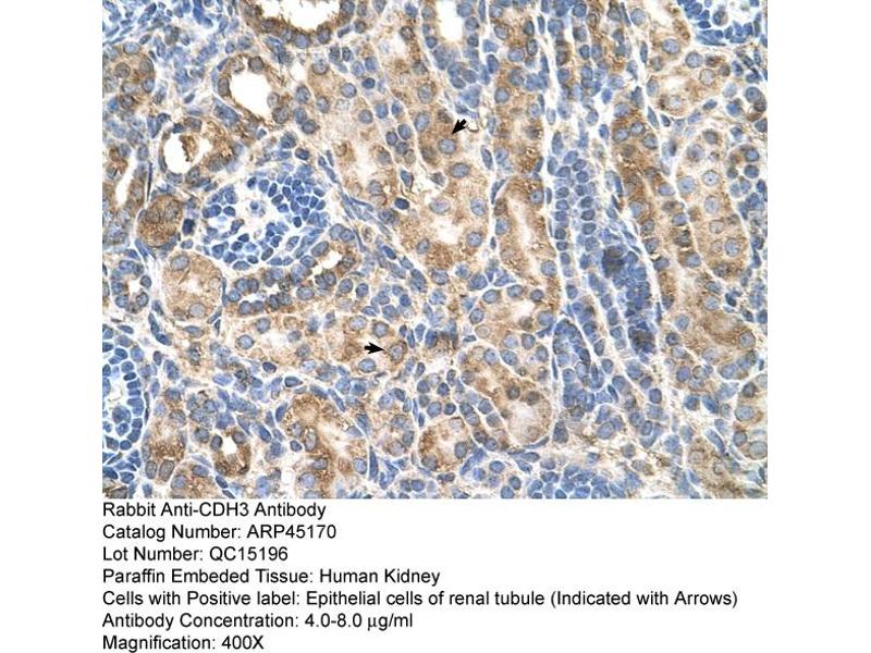 CDH3 is a classical cadherin from the cadherin superfamily. The protein is a calcium-dependent cell-cell adhesion glycoprotein comprised of five extracellular cadherin repeats, a transmembrane region and a highly conserved cytoplasmic tail. Its gene is located in a six-cadherin cluster in a region on the long arm of chromosome 16 that is involved in loss of heterozygosity events in breast and prostate cancer. In addition, aberrant expression of this protein is observed in cervical adenocarcinomas. Mutations in its gene have been associated with congential hypotrichosis with juvenile macular dystrophy.This gene is a classical cadherin from the cadherin superfamily. The encoded protein is a calcium-dependent cell-cell adhesion glycoprotein comprised of five extracellular cadherin repeats, a transmembrane region and a highly conserved cytoplasmic tail. This gene is located in a six-cadherin cluster in a region on the long arm of chromosome 16 that is involved in loss of heterozygosity events in breast and prostate cancer. In addition, aberrant expression of this protein is observed in cervical adenocarcinomas. Mutations in this gene have been associated with congential hypotrichosis with juvenile macular dystrophy.