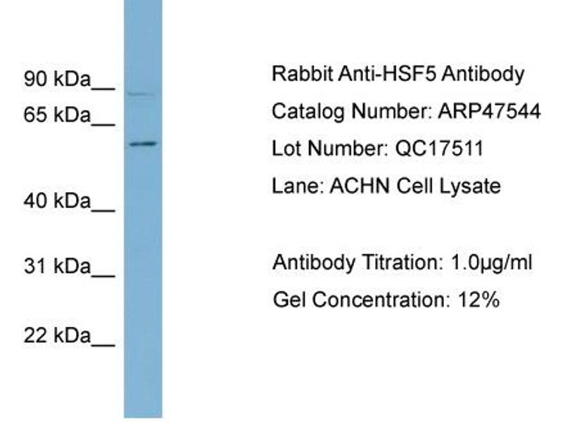 - This is a rabbit polyclonal antibody against HSF5. It was validated on Western Blot using a cell lysate as a positive control.