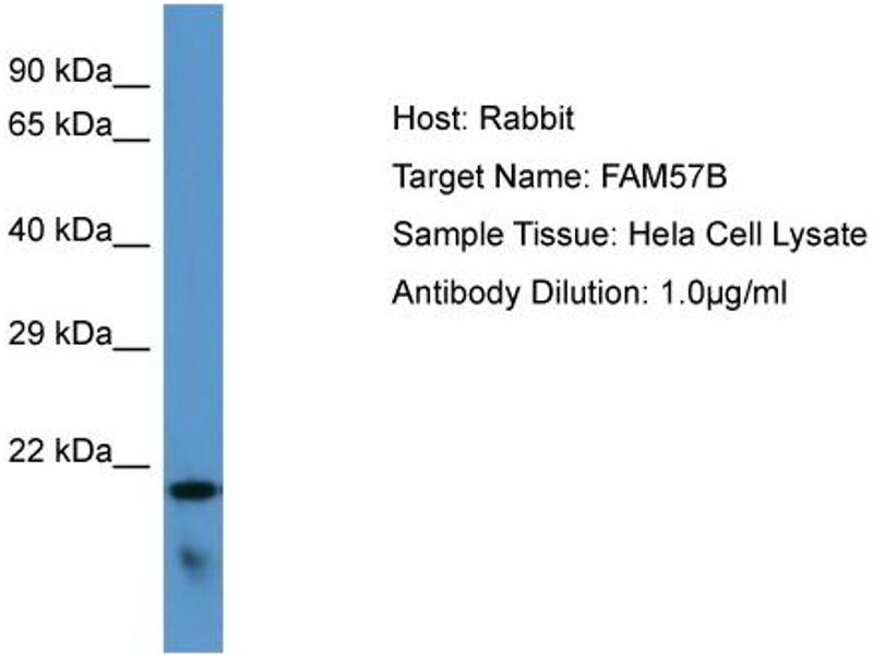 This is a rabbit polyclonal antibody against FAM57B. It was validated on Western Blot.