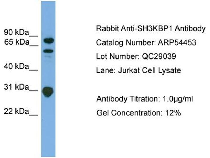 - This is a rabbit polyclonal antibody against SH3KBP1. It was validated on Western Blot using a cell lysate as a positive control.