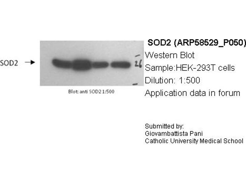 - This is a rabbit polyclonal antibody against SOD2. It was validated on Western Blot using a cell lysate as a positive control.