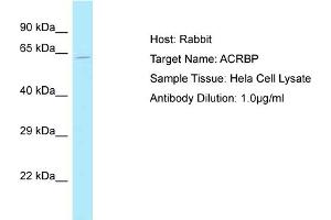 L’anticorps Lapin Polyclonal anti-ACRBP a été validé pour WB. Il convient pour détecter ACRBP dans des échantillons de Humain, Boeuf (Vache), Chien, Cheval, Porc et Lapin.