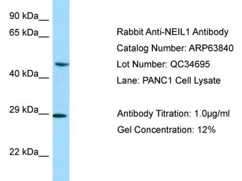This is a rabbit polyclonal antibody against NEIL1. It was validated on Western Blot.