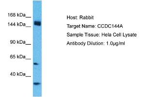 This is a rabbit polyclonal antibody against CCDC144A. It was validated on Western Blot.