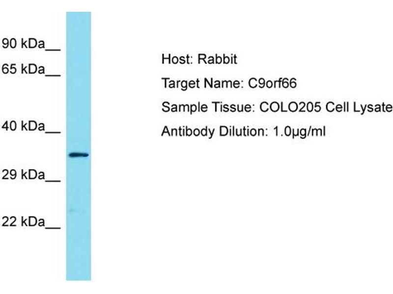 This is a rabbit polyclonal antibody against C9orf66. It was validated on Western Blot.