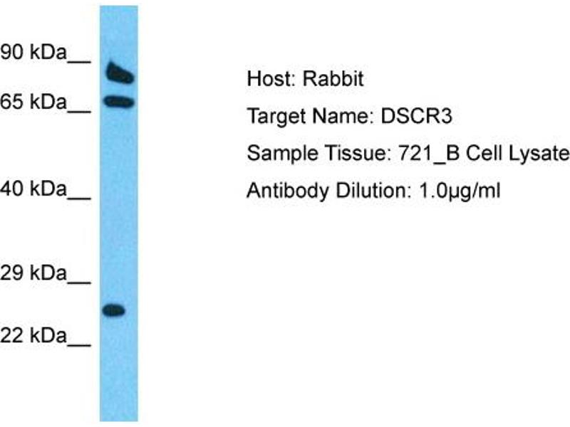 Cet anticorps Lapin Polyclonal détecte spécifiquement DSCR3 dans WB. Il présente une réactivité avec des échantillons de Humain, Rat, Souris, Boeuf (Vache), Chien, Cobaye, Cheval et Lapin.