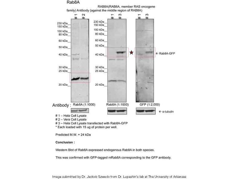 - This is a rabbit polyclonal antibody against RAB8A. It was validated on Western Blot using a cell lysate as a positive control.