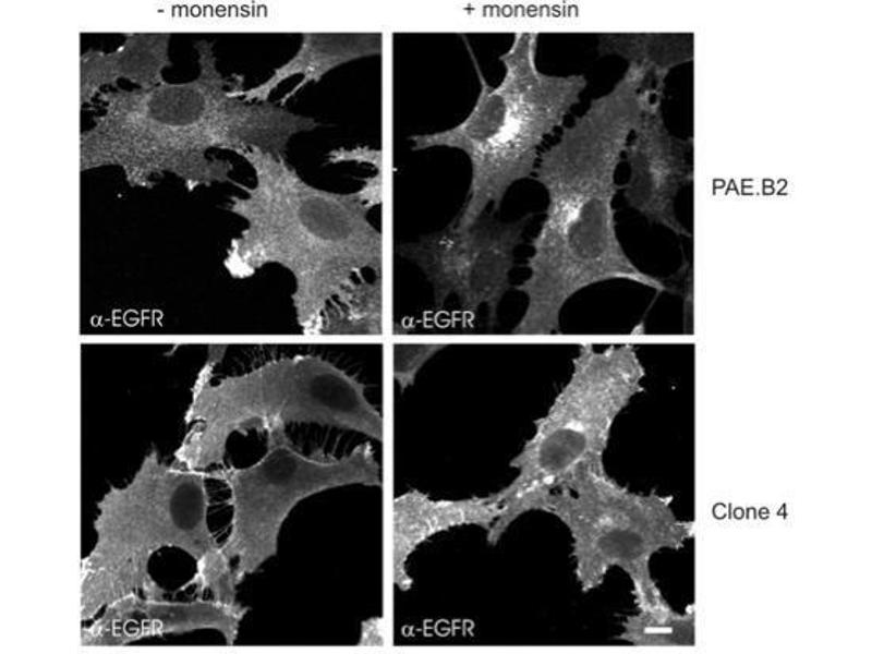 - EGFR antibody was raised in sheep using a synthetic 20 amino acid peptide of human EGFr representing a portion of the internal domain proximal to a phosphorylation region as the immunogen.