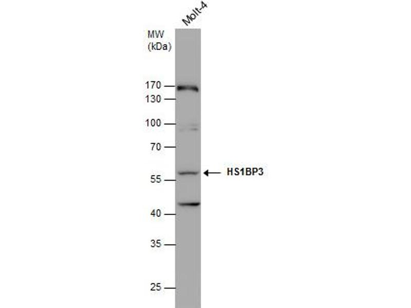 - Carrier-protein conjugated synthetic peptide encompassing a sequence within the C-terminus region of human HS1BP3. The exact sequence is proprietary.
