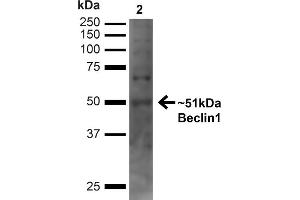 A 1:1000 dilution of ABIN2868758 was sufficient for detection of Beclin1 on 293T lysates using Goat anti-rabbit IgG:HRP as the secondary antibody.