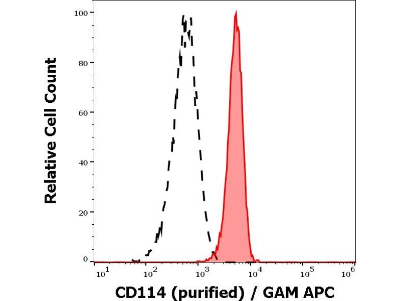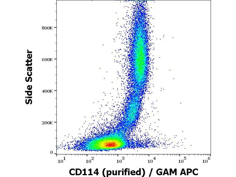 Colony stimulating factor 3 receptor,CD114 / G-CSFR (granulocyte colony-stimulating factor receptor, also known as CSF3R) is a type I transmembrane glycoprotein which upon binding of its ligand (G-CSF, granulocyte colony-stimulating factor) homodimerizes and activates signaling transduction to mediate cell proliferation, survival, and differentiation. It is expressed by granulocytes at all stages of their differentiation, as well as by monocytes, dendritic cells, and mature platelets. Among non-hematopoietic cells, it is expressed e.g. by endothelial cells, placenta, trophoblasts, and many tumor cell lines. This antigen is a target for stem cell mobilization for blood stem cell transplantation, for enhancing recovery of myelopoiesis following chemotherapy and in the treatment of patients with severe chronic neutropenia.,GCSFR, CSF3R, SCN7