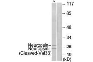 - Neuropsin (Cleaved-Val33) Antibody detects endogenous levels of fragment of activated Neuropsin resulting from cleavage adjacent to Val33.