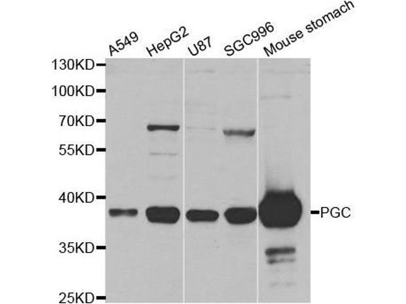 - This gene encodes an aspartic proteinase that belongs to the peptidase family A1. The encoded protein is a digestive enzyme that is produced in the stomach and constitutes a major component of the gastric mucosa. This protein is also secreted into the serum. This protein is synthesized as an inactive zymogen that includes a highly basic prosegment. This enzyme is converted into its active mature form at low pH by sequential cleavage of the prosegment that is carried out by the enzyme itself. Polymorphisms in this gene are associated with susceptibility to gastric cancers. Serum levels of this enzyme are used as a biomarker for certain gastric diseases including Helicobacter pylori related gastritis. Alternate splicing results in multiple transcript variants. A pseudogene of this gene is found on chromosome 1.,PGC,PEPC,PGII,gastricsin,Cancer,Tumor biomarkers,Signal Transduction,Endocrine & Metabolism,Amino acid metabolism,PGC