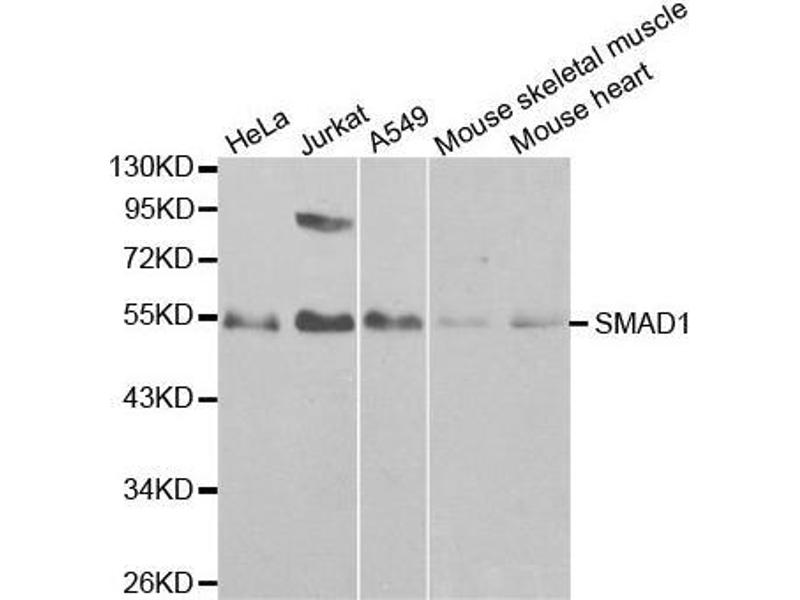 The protein encoded by this gene belongs to the SMAD, a family of proteins similar to the gene products of the Drosophila gene 'mothers against decapentaplegic' (Mad) and the C. elegans gene Sma. SMAD proteins are signal transducers and transcriptional modulators that mediate multiple signaling pathways. This protein mediates the signals of the bone morphogenetic proteins (BMPs), which are involved in a range of biological activities including cell growth, apoptosis, morphogenesis, development and immune responses. In response to BMP ligands, this protein can be phosphorylated and activated by the BMP receptor kinase. The phosphorylated form of this protein forms a complex with SMAD4, which is important for its function in the transcription regulation. This protein is a target for SMAD-specific E3 ubiquitin ligases, such as SMURF1 and SMURF2, and undergoes ubiquitination and proteasome-mediated degradation. Alternatively spliced transcript variants encoding the same protein have been observed.,BSP-1,BSP1,JV4-1,JV41,MADH1,MADR1,Smad1,SMAD1,Epigenetics & Nuclear Signaling,Transcription Factors,Cancer,Signal Transduction,Cell Biology & Developmental Biology,Growth factor,TGF-b-Smad Signaling Pathway,ESC Pluripotency and Differentiation,Immunology & Inflammation,Stem Cells,SMADs,SMAD1