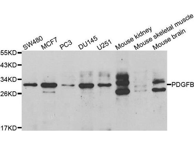 This gene encodes a member of the protein family comprised of both platelet-derived growth factors (PDGF) and vascular endothelial growth factors (VEGF). The encoded preproprotein is proteolytically processed to generate platelet-derived growth factor subunit B, which can homodimerize, or alternatively, heterodimerize with the related platelet-derived growth factor subunit A. These proteins bind and activate PDGF receptor tyrosine kinases, which play a role in a wide range of developmental processes. Mutations in this gene are associated with meningioma. Reciprocal translocations between chromosomes 22 and 17, at sites where this gene and that for collagen type 1, alpha 1 are located, are associated with dermatofibrosarcoma protuberans, a rare skin tumor. Alternative splicing results in multiple transcript variants.,PDGFB,IBGC5,PDGF-2,PDGF2,SIS,SSV,c-sis,Cancer,Signal Transduction,Cell Biology & Developmental Biology,Growth factor,Endocrine & Metabolism,Immunology & Inflammation,Cytokines,Cardiovascular,Angiogenesis,Blood,Serum Proteins,Hypoxia,Heart,Cardiovascular diseases,Heart disease,PDGFB