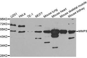 Proteins of the matrix metalloproteinase (MMP) family are involved in the breakdown of extracellular matrix in normal physiological processes, such as embryonic development, reproduction, and tissue remodeling, as well as in disease processes, such as arthritis and metastasis. Most MMP's are secreted as inactive proproteins which are activated when cleaved by extracellular proteinases. This gene encodes an enzyme which degrades fibronectin, laminin, collagens III, IV, IX, and X, and cartilage proteoglycans. The enzyme is thought to be involved in wound repair, progression of atherosclerosis, and tumor initiation. The gene is part of a cluster of MMP genes which localize to chromosome 11q22.3.,MMP3,CHDS6,MMP-3,SL-1,STMY,STMY1,STR1,Cancer,Tumor biomarkers,Invasion and Metastasis,Signal Transduction,G protein signaling,G2/M DNA Damage Checkpoint,Cell Biology & Developmental Biology,Cytoskeleton,Extracellular Matrix,MMPs,Ubiquitin,Cardiovascular,Angiogenesis,MMP3